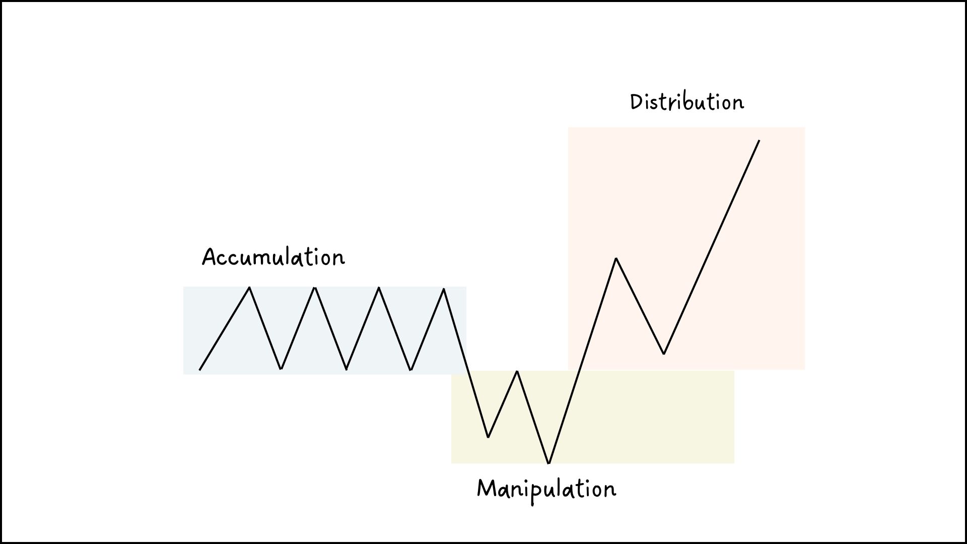 Accumulation: Price moves sideways, builds liquidity, and traps traders in chop. This phase is difficult to trade and often leads to stop-outs.
