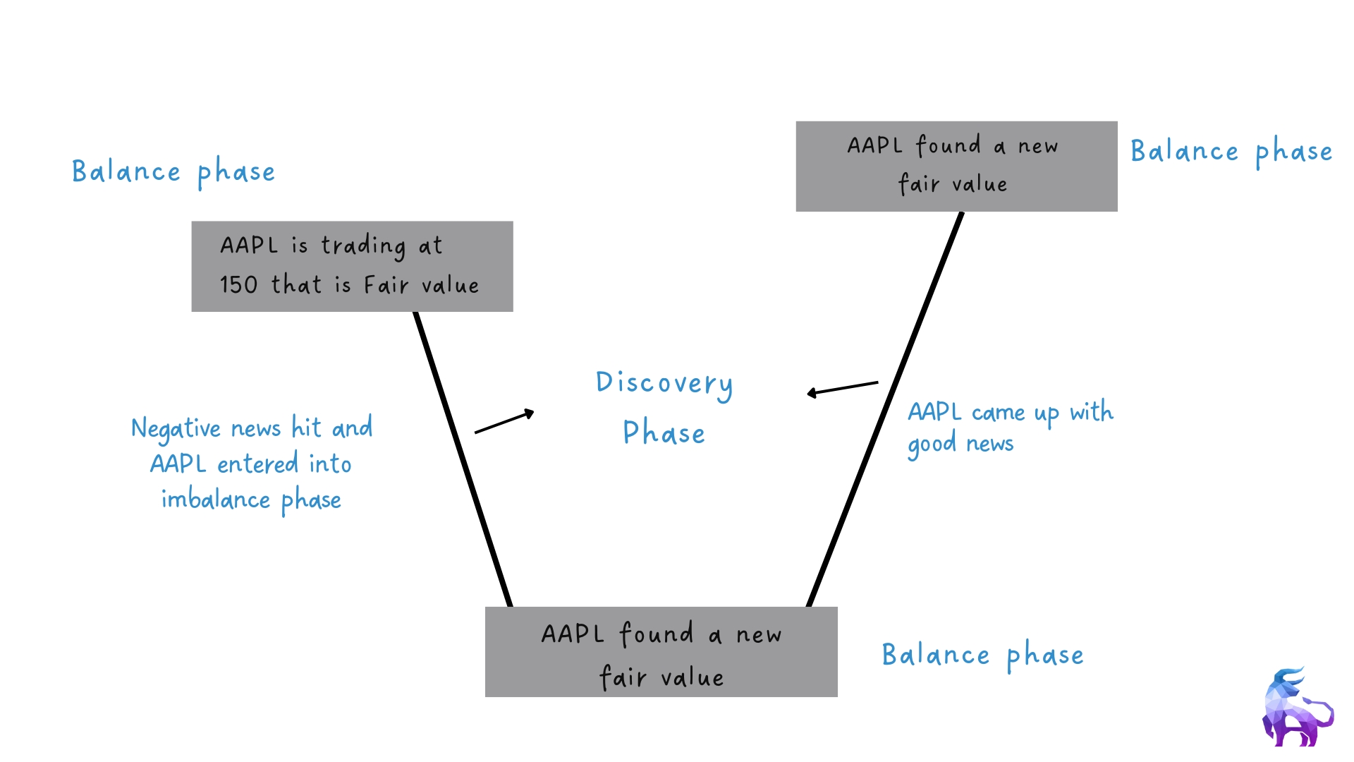 Then, negative news hits — there’s a battery issue in the new iPhone. Investors panic, and selling pressure increases. Apple’s stock enters the discovery phase, searching for a new price where buyers and sellers will balance again.