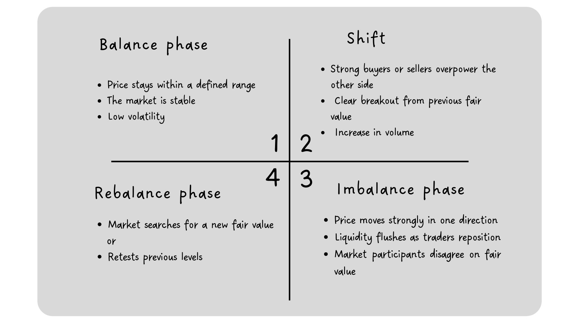 Markets are constantly transitioning between these three phases — balance, imbalance, and rebalancing.