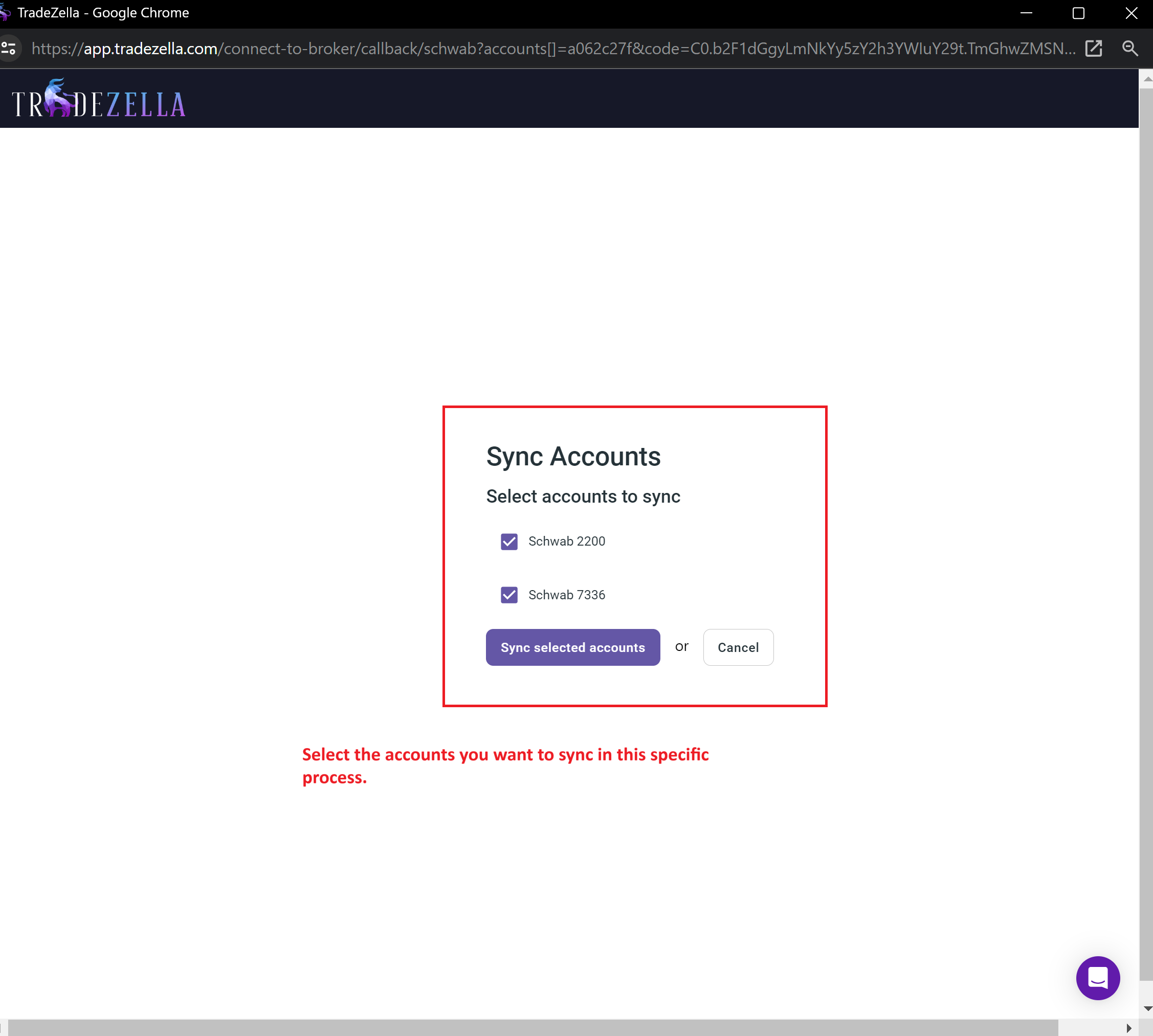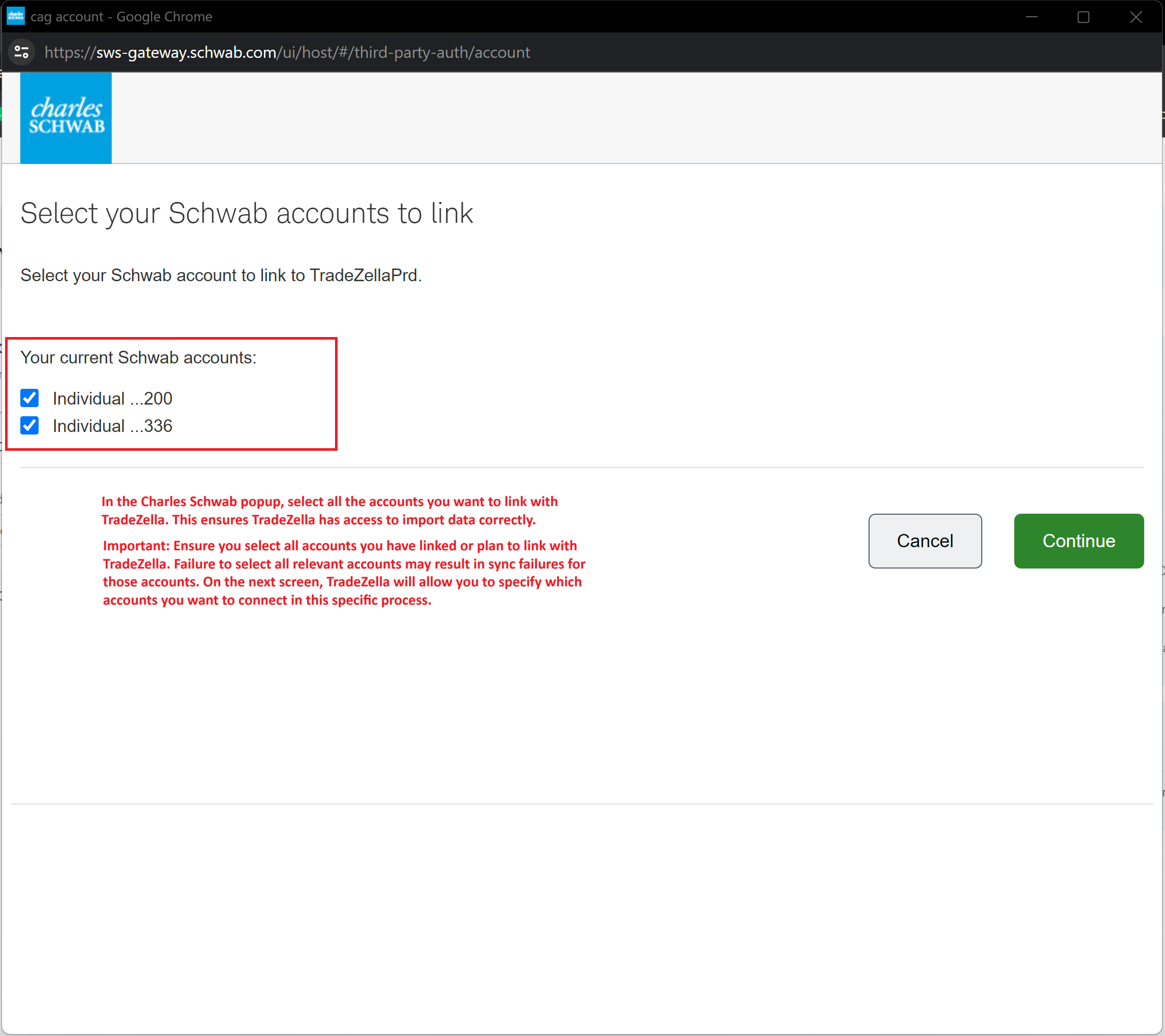 In the Charles Schwab popup, select all the accounts you want to link with TradeZella. This ensures TradeZella has access to import data correctly.