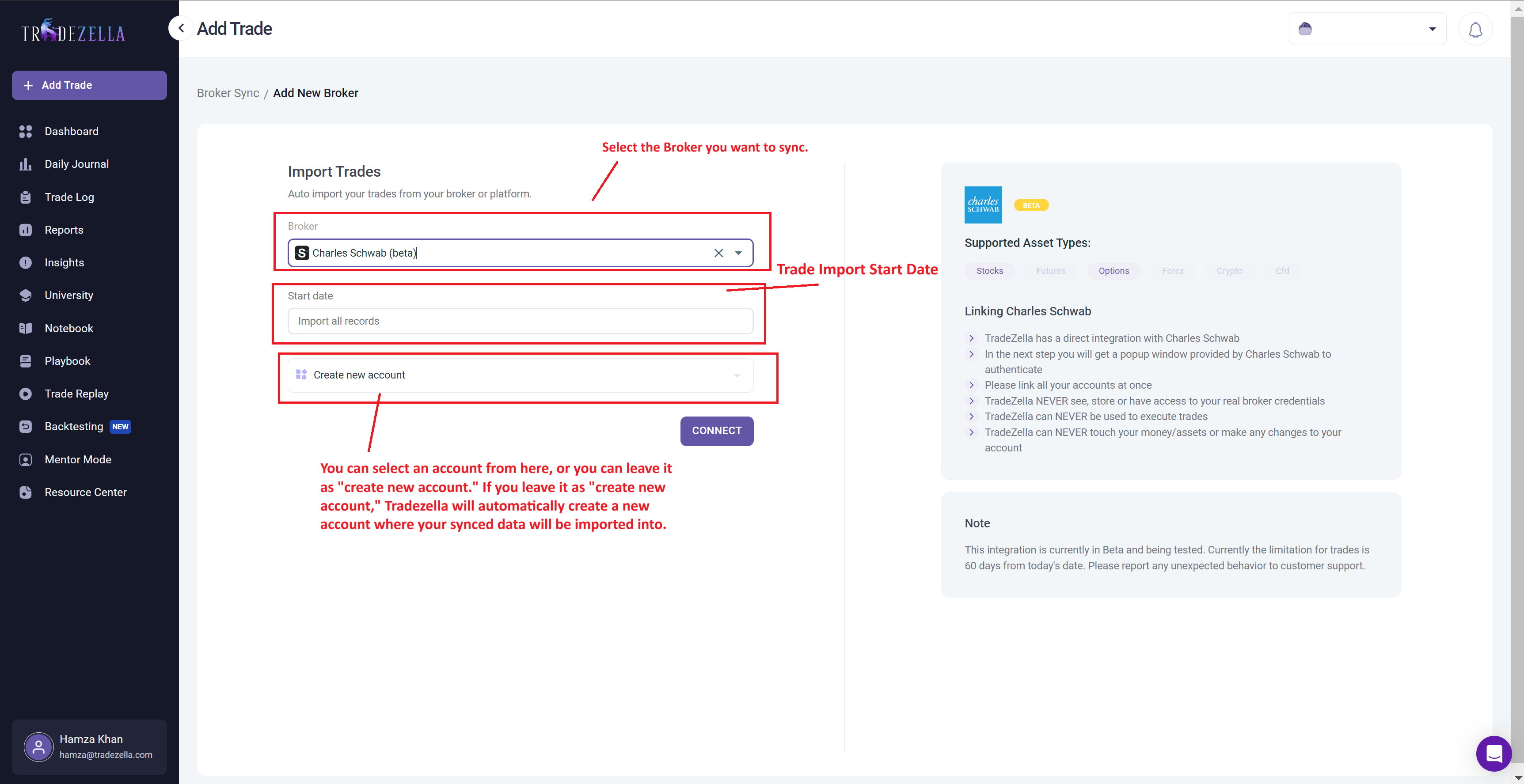 Syncing your TOS Charles Schwab broker with TradeZella is a straightforward process. Follow these steps to ensure your trading data is seamlessly integrated: