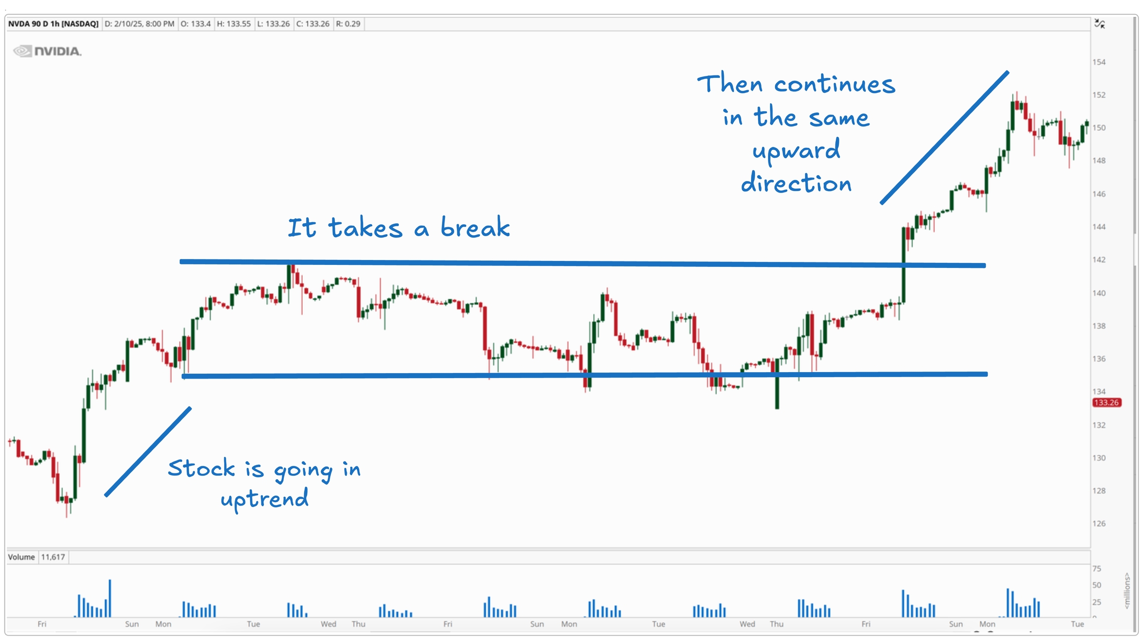 This pattern represents a battle between buyers (bulls) and sellers (bears). The market is consolidating, meaning it’s taking a break before deciding on its next move.