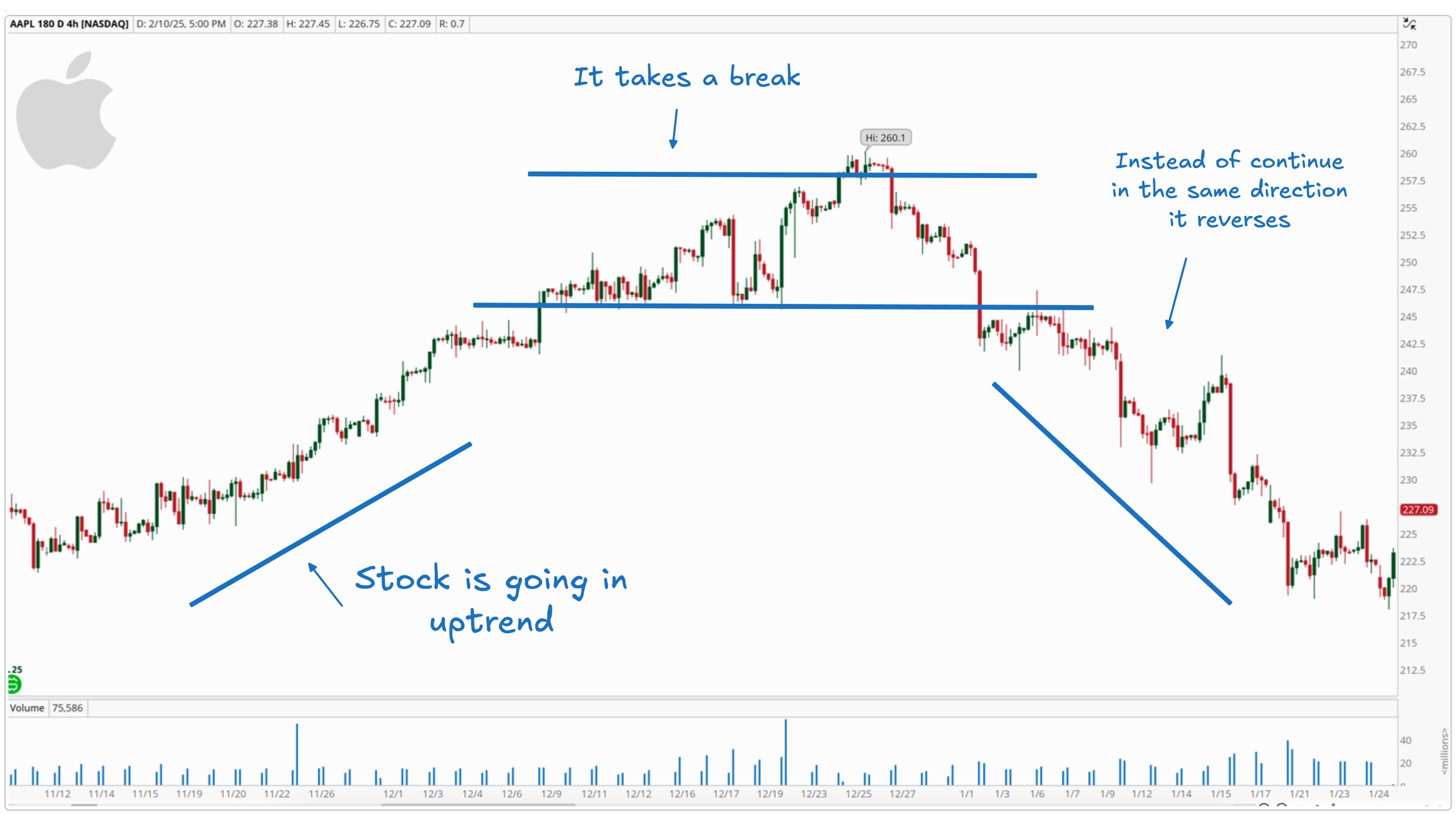 At first, buyers are in control as price pushes higher. When the first top forms, sellers step in and push the price back down. This is normal — it’s just a pullback.