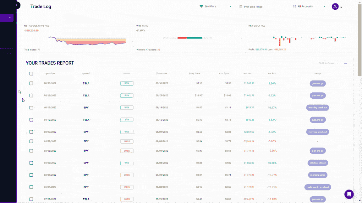 Conveniently split a single trade or merge multiple trades on your Trade Log by simply selecting a trade or trades and choosing the action from the Bulk Action drop-down menu.
