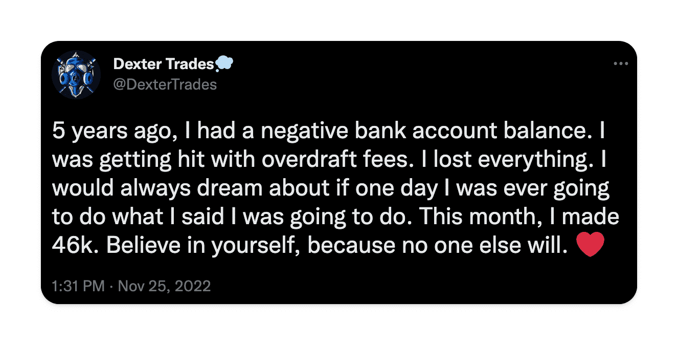 Towards the end of November, DexterTrades took to Twitter to share his amazing feat and put it in perspective for new and struggling traders that this has been a work in progress for years.