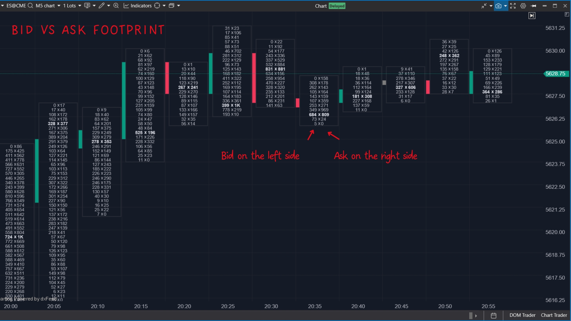 The bid/ask footprint seen above is the exact same candle as the delta candle on the right.
