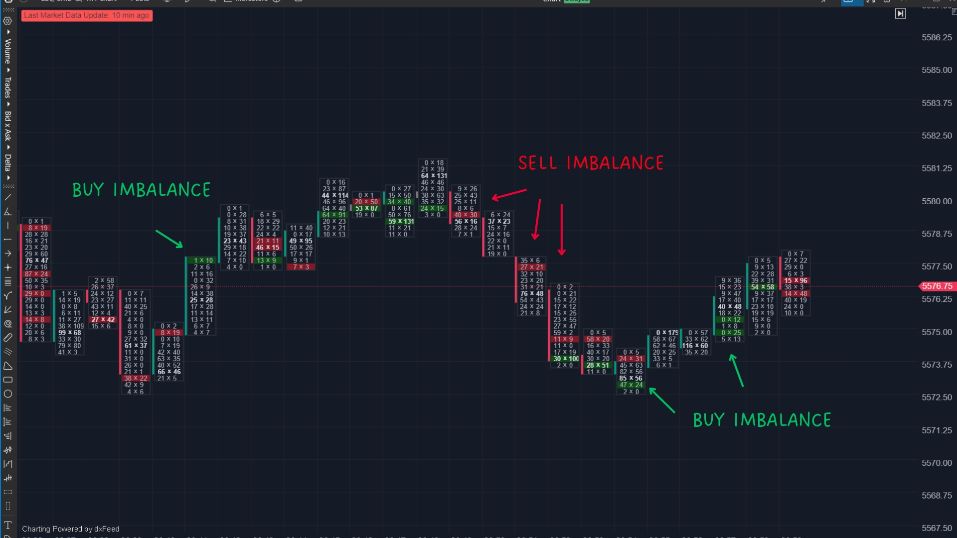 Buy and sell imbalances occur when there is a significant difference between the number of contracts traded at the bid versus the ask. This helps traders identify areas where aggressive buyers or sellers are dominating, which can indicate potential support, resistance, or future price movement.