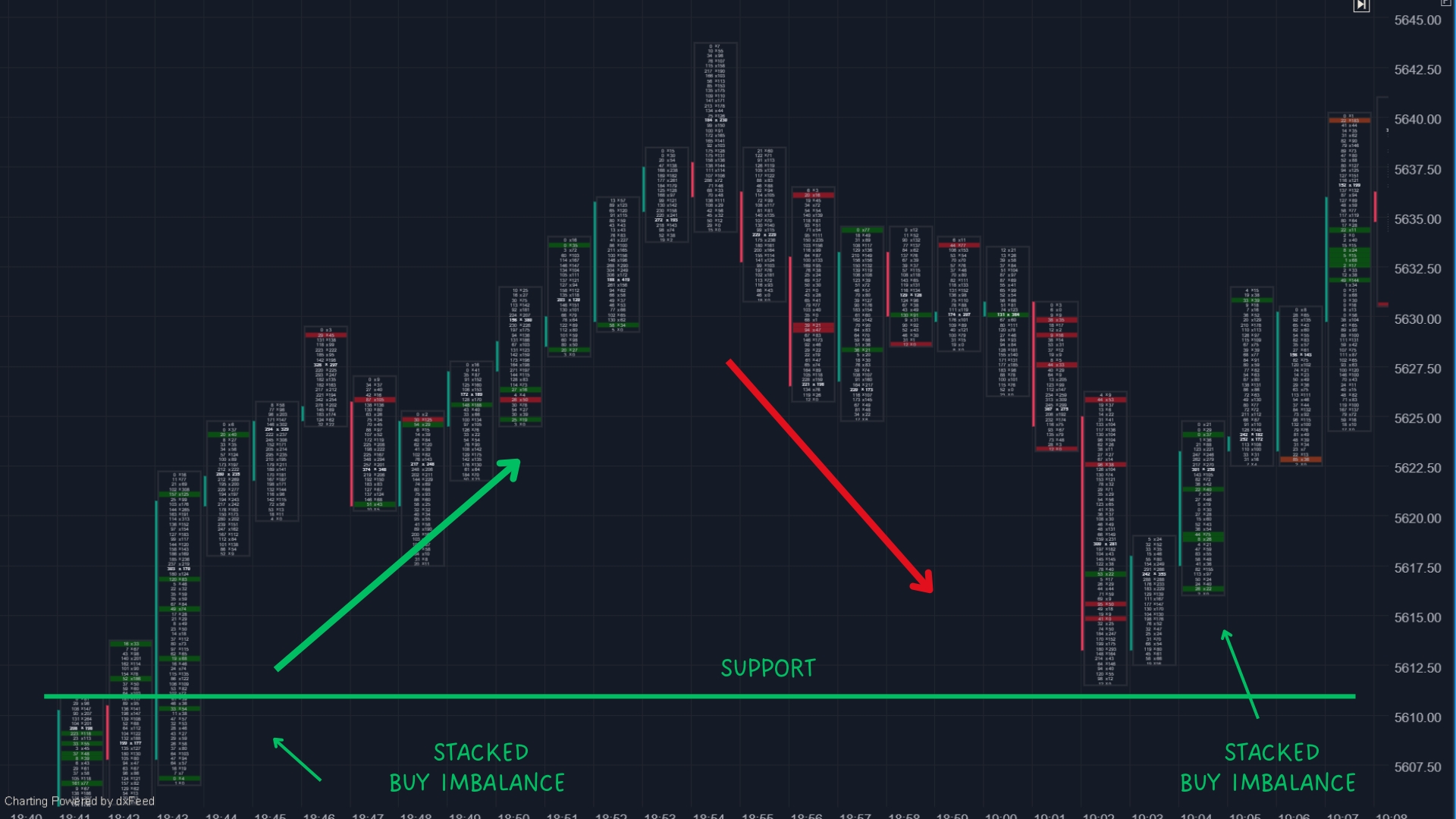 A stacked sell imbalance at support, but price isn’t moving lower, suggests buyers are stepping in with large limit orders to stop the decline.