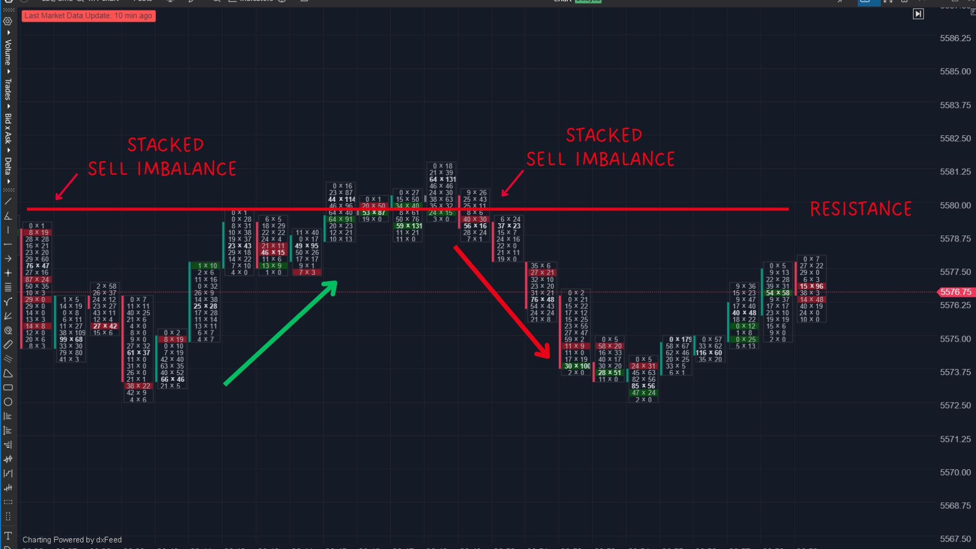 A stacked buy imbalance at resistance, but price isn’t moving up, suggests heavy limit sell orders are absorbing buying pressure.