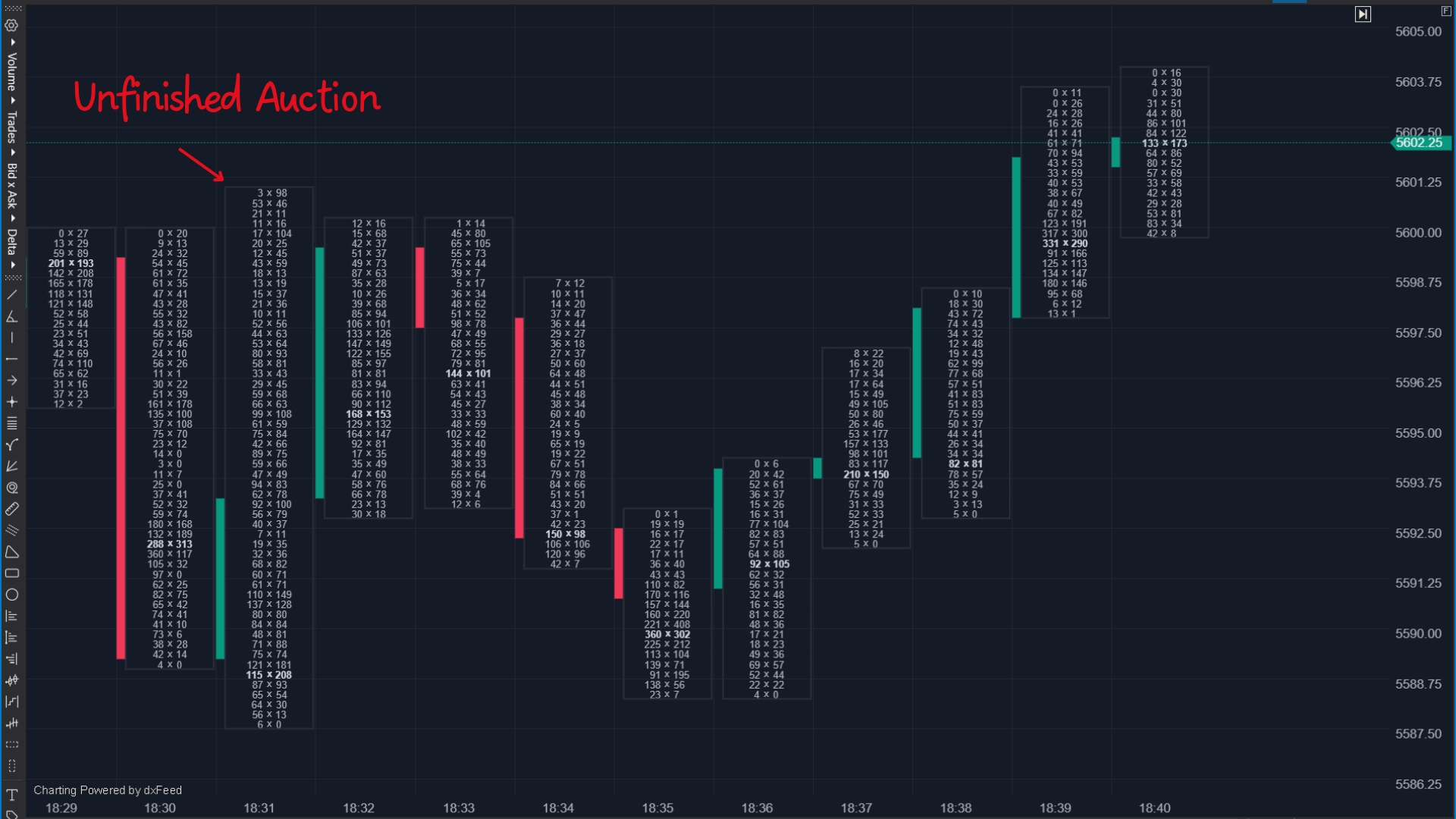On a footprint chart, you can identify an unfinished auction when both bid and ask trades are still active at the high or low of a move. This means traders were still willing to buy and sell at that level, leaving unfinished business.