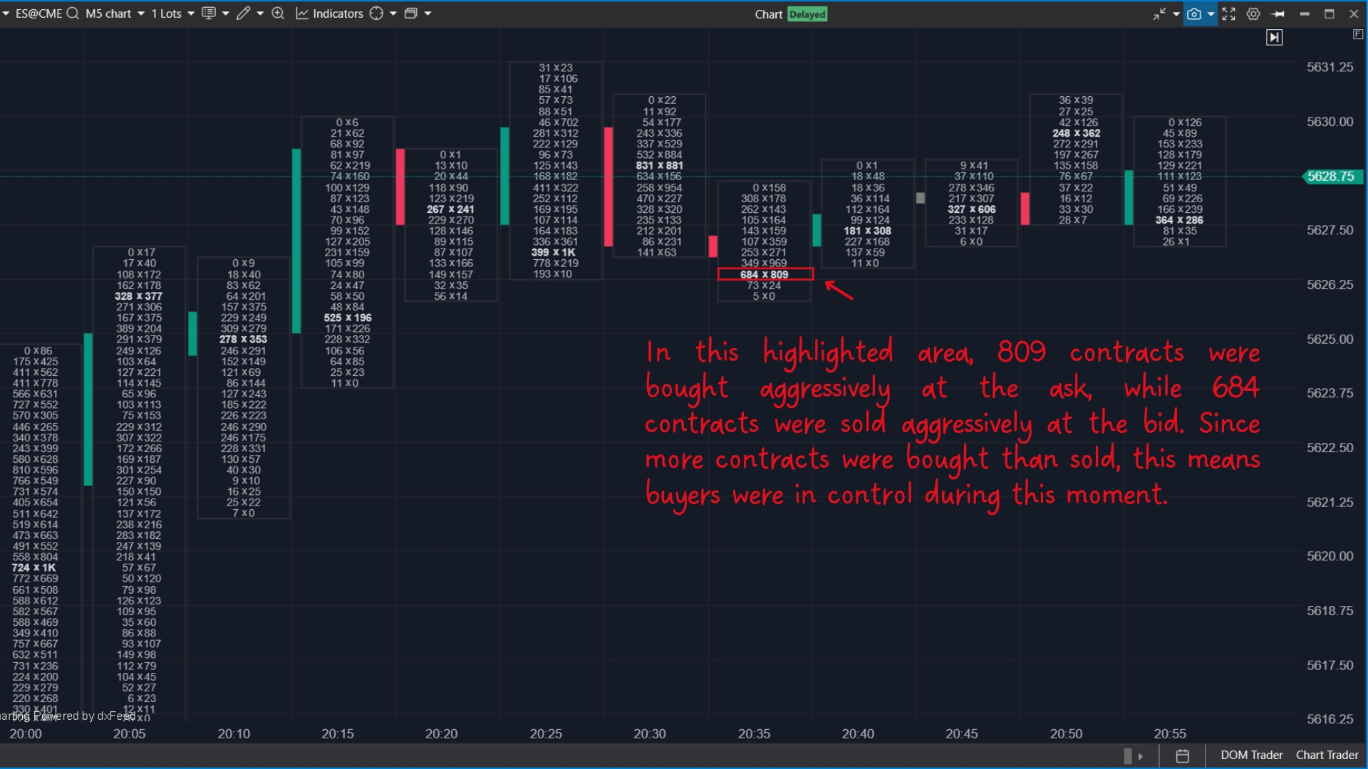 In the image above, the highlighted area shows 809 contracts were bought aggressively at the ask, while 684 contracts were sold aggressively at the bid. Since more contracts were bought than sold, it indicates that buyers were in control at the time.