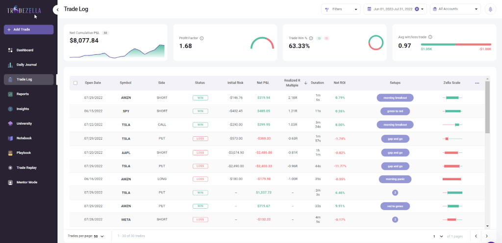 You can journal using a spreadsheet and a template, but the most powerful way is to use TradeZella’s unique journaling software. We’ve got a wide range of features to help you notice patterns quicker and develop more successful strategies.
