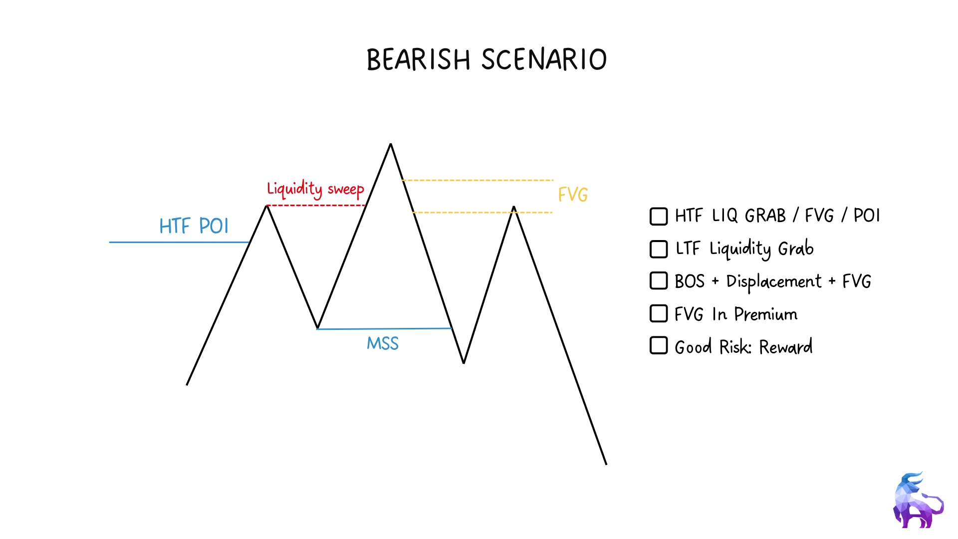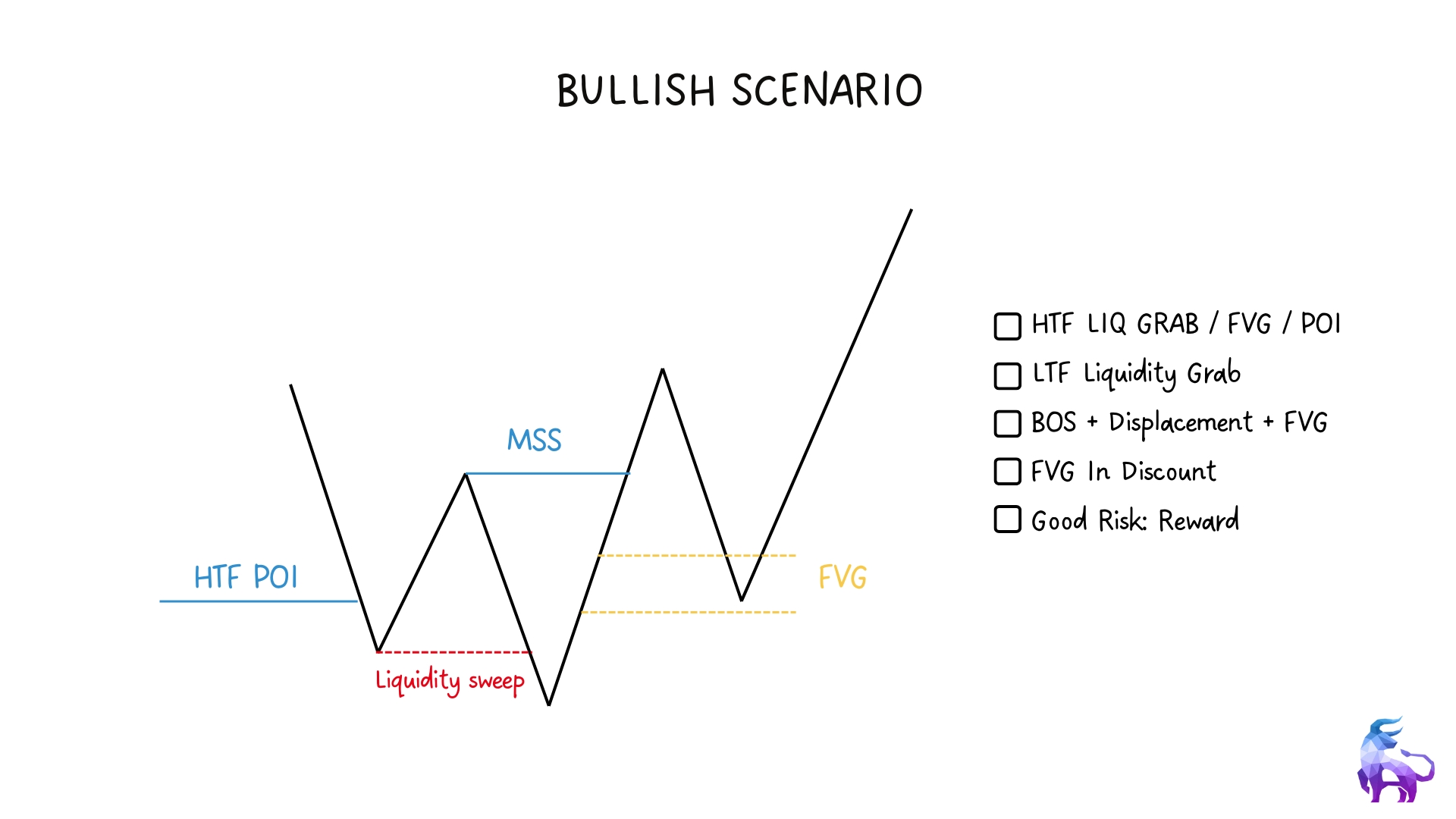 This ICT model is a structured way to find high-probability trade setups using key smart money concepts like liquidity, fair value gaps, and market structure shifts. It focuses on using higher timeframes to guide your trade direction, then using lower timeframes to find precise entries.
