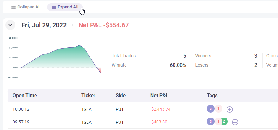 Click on a day on your Calendar for a quick preview of that trading day–all the trades you’ve taken and the resulting stats.