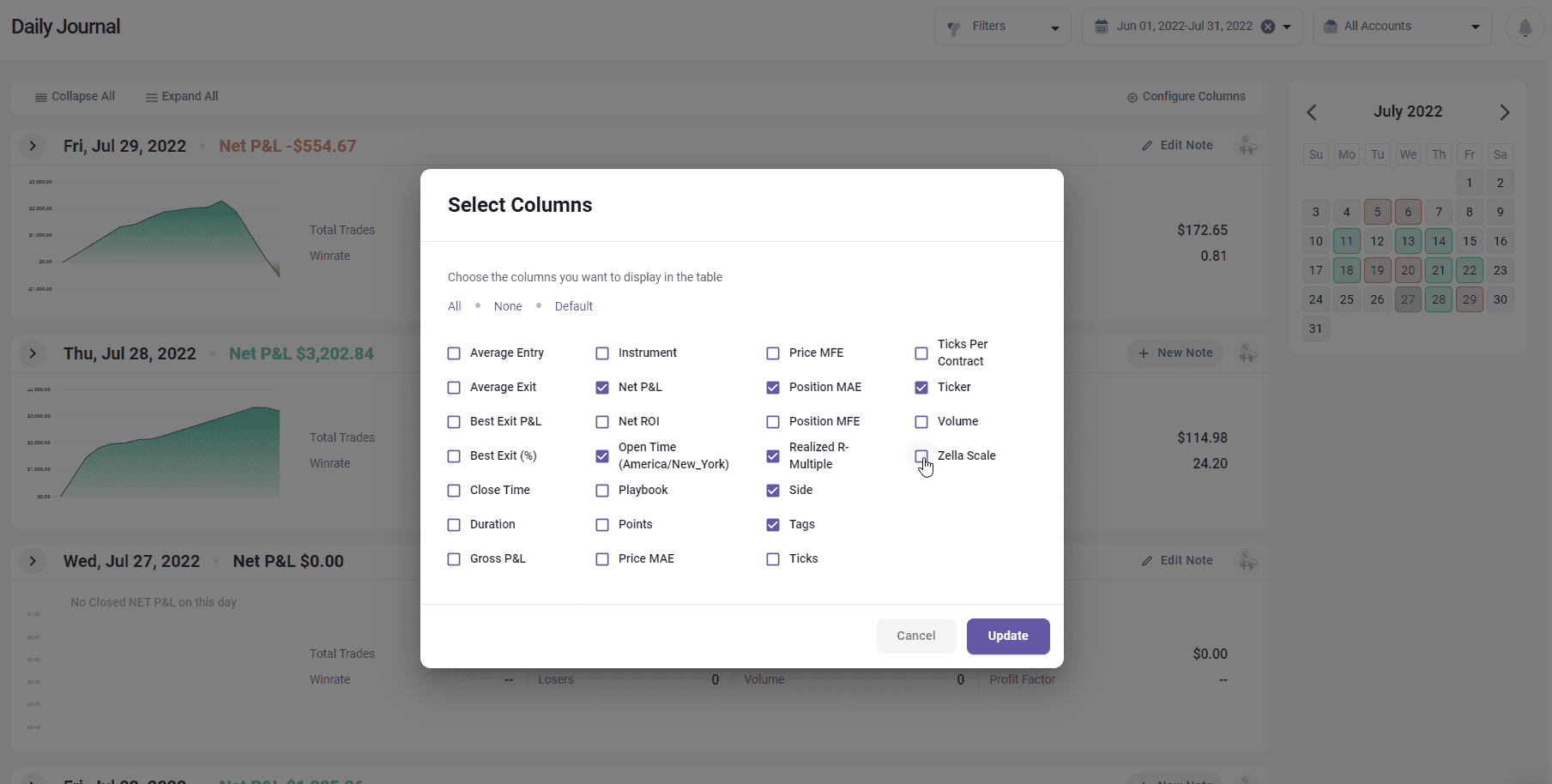 We’ve also added more stats available for you to analyze and review your trades better, like Playbook, Swaps, Ticks, etc. Simply click on the (•••) button to select/deselect what you’d like to include on this page.