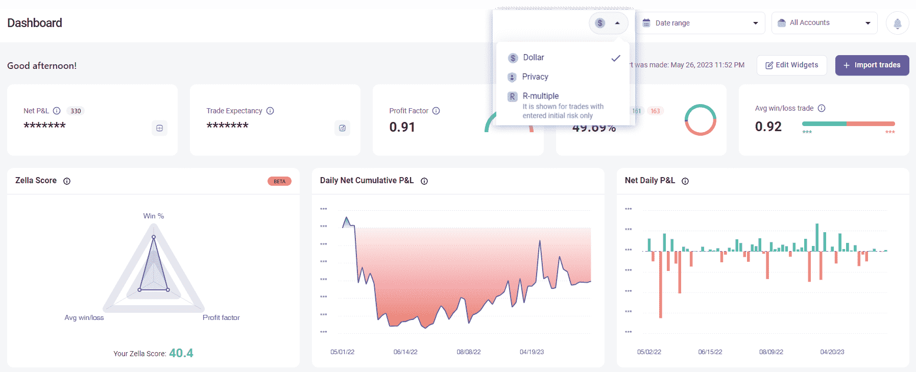 Aside from Dollar ($) and R-Multiple View, you now also have the option to switch to Privacy mode and hide your numbers using asterisks (*).