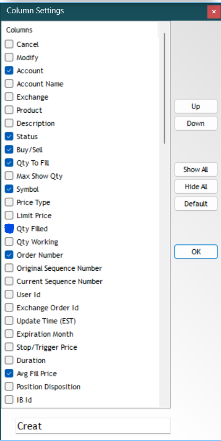 Account | Status | Remarks | Buy/Sell | Qty To Fill | Symbol | Qty Filled | Avg Fill Price | Limit price | Order Number | Create Time | Update Time | Commission (if applicable)