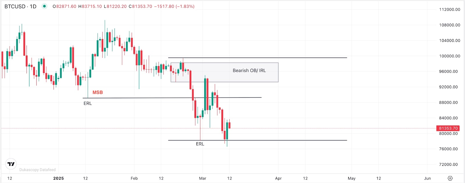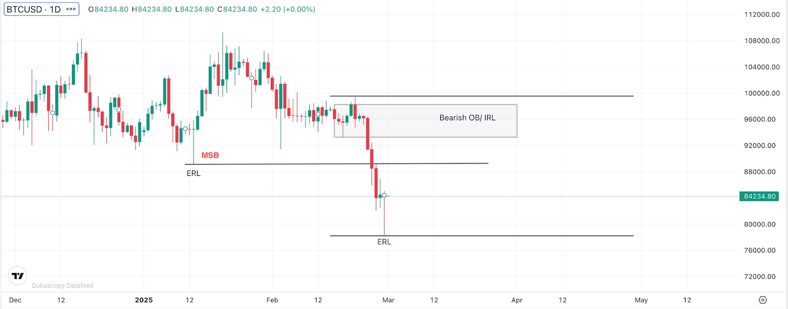 - Market Structure Break (MSB): Price broke below a key swing low, confirming a bearish structure.