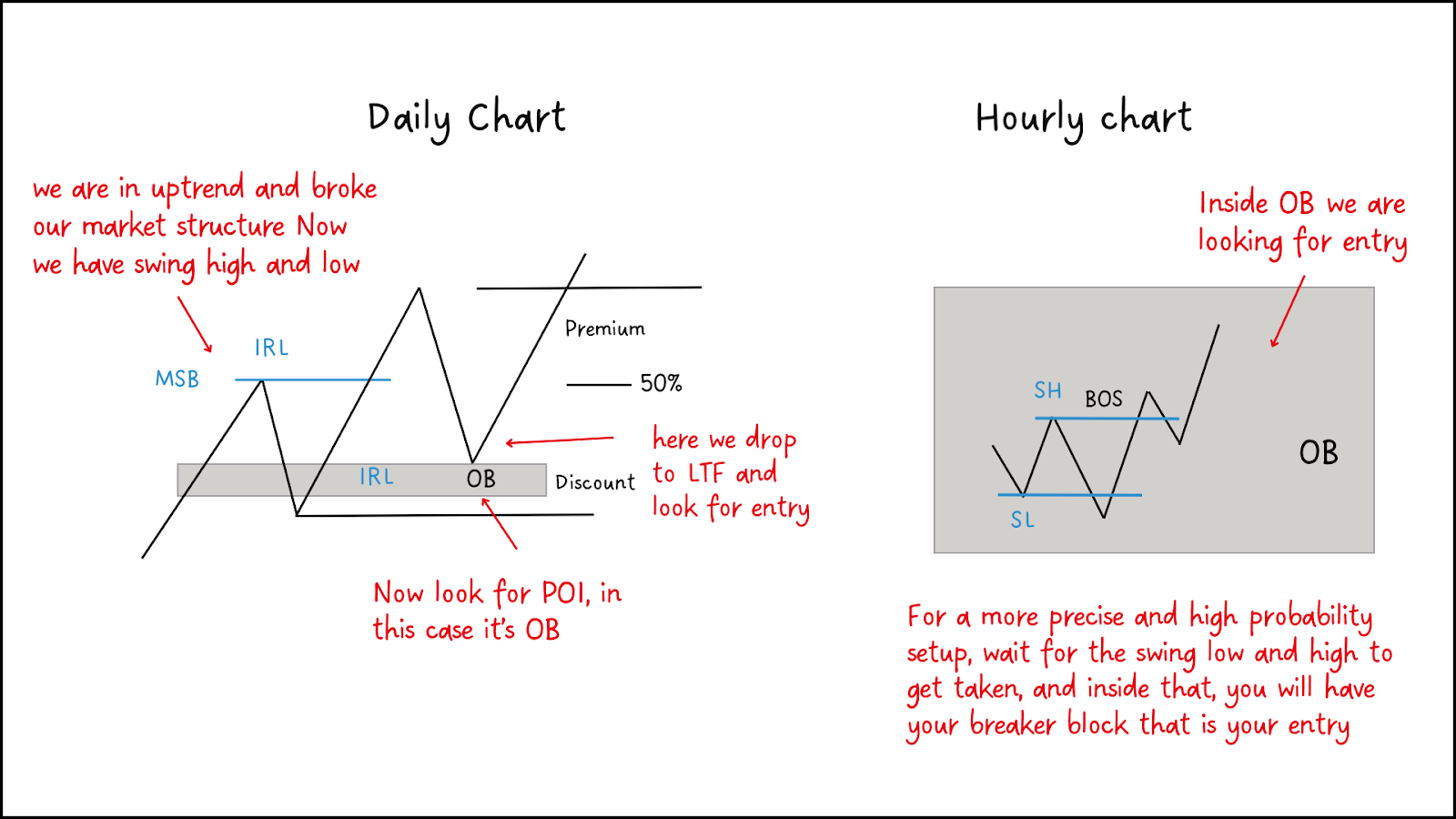 We start by identifying a clean market structure break on the higher timeframe, such as the daily or weekly chart. From there, we mark out the POI that led to the break, typically an Order Block (OB) or Breaker Block. This POI becomes the zone where we expect the next higher low (in an uptrend) or lower high (in a downtrend) to form.