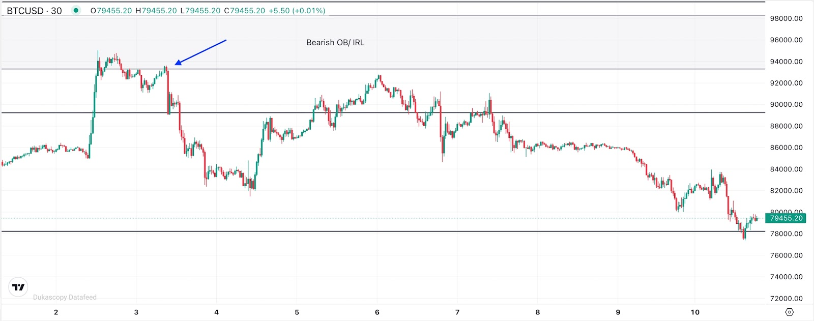 - Price came back into the OB and started building up liquidity — multiple swing lows formed inside the zone.