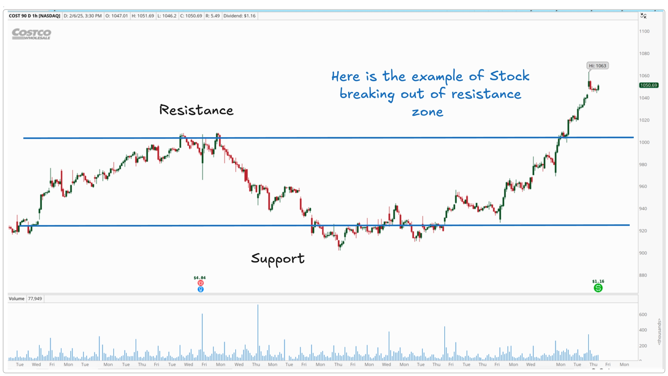 Here is an example of a stock breaking through resistance, but it turned out to be a false breakout.