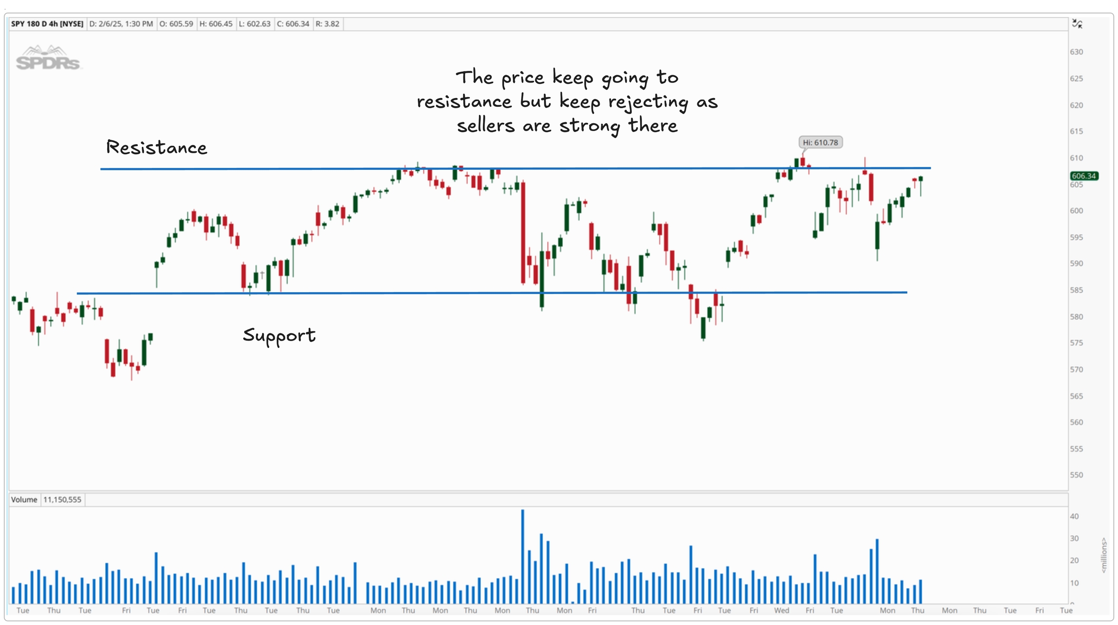 Resistance is just the opposite. It’s a price level where selling pressure is strong enough to stop the price from going higher. Think of it like a ceiling that price keeps hitting but can’t break through. When the price reaches resistance, sellers start selling, pushing the price back down. If the price keeps going to a certain level and then drops, that level acts as resistance.