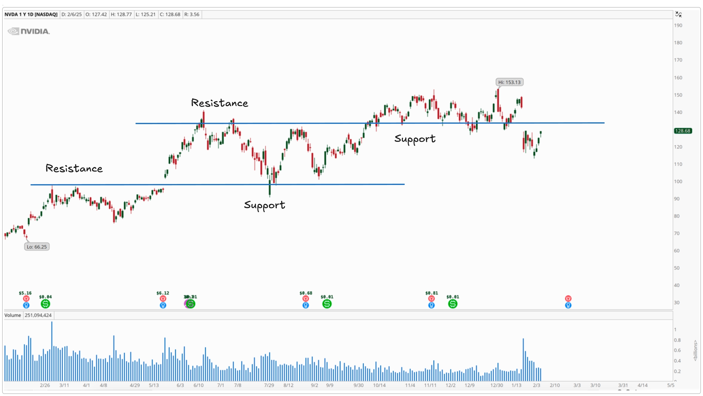 This chart of NVIDIA (NVDA) shows how support and resistance levels can switch roles over time.