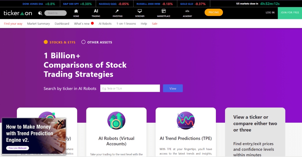 Tickeron is a good example, with an eye-wateringly large selection of AI-developed stock strategies to explore.