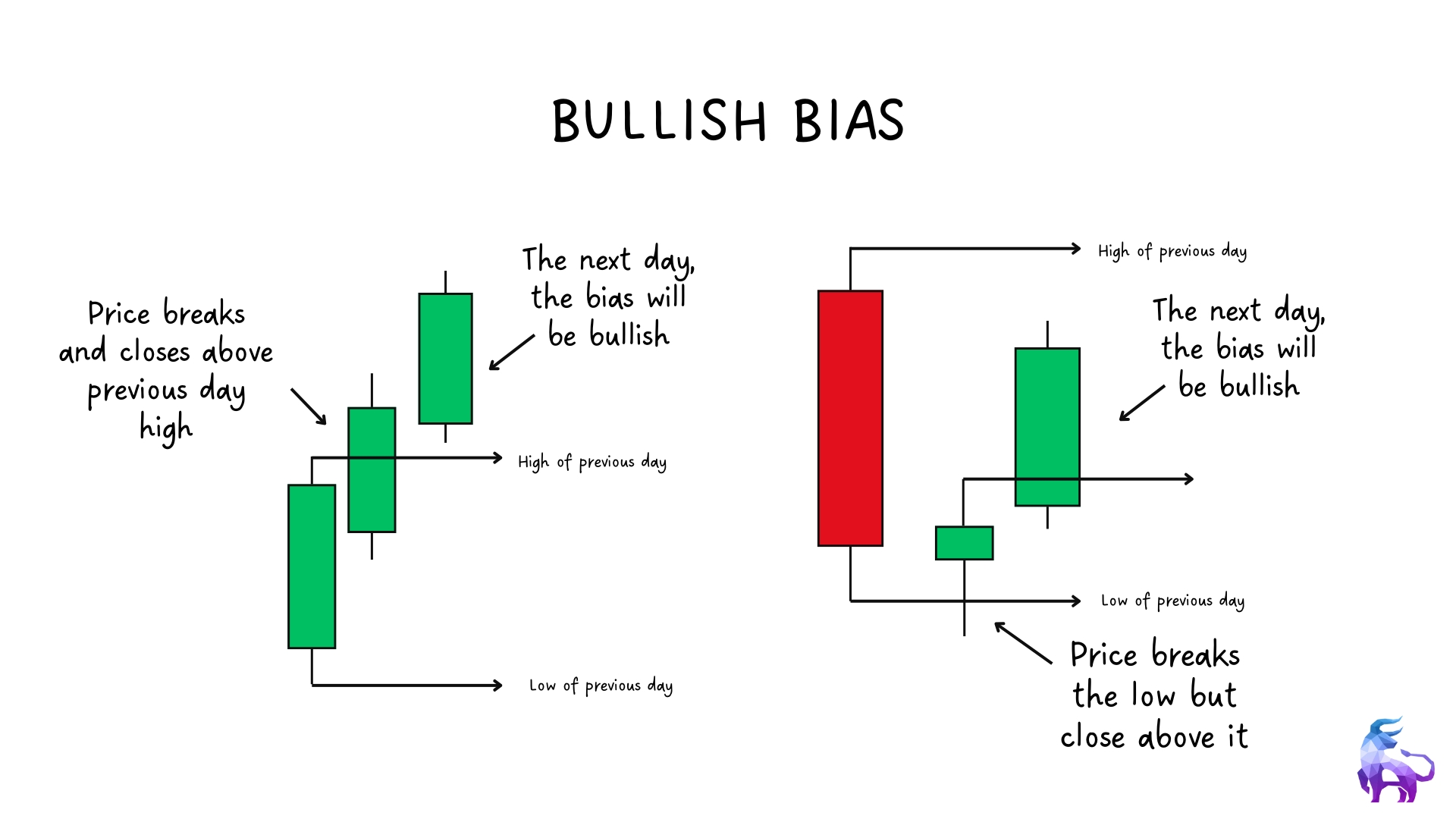 - A bullish bias forms when price closes above the previous high or sweeps the low and closes back inside the range.