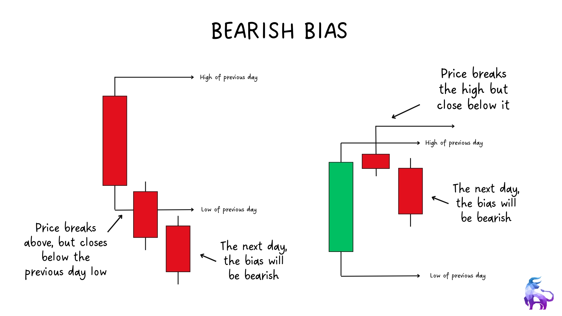 - A bearish bias forms when price closes below the previous low or sweeps the high and closes back inside.