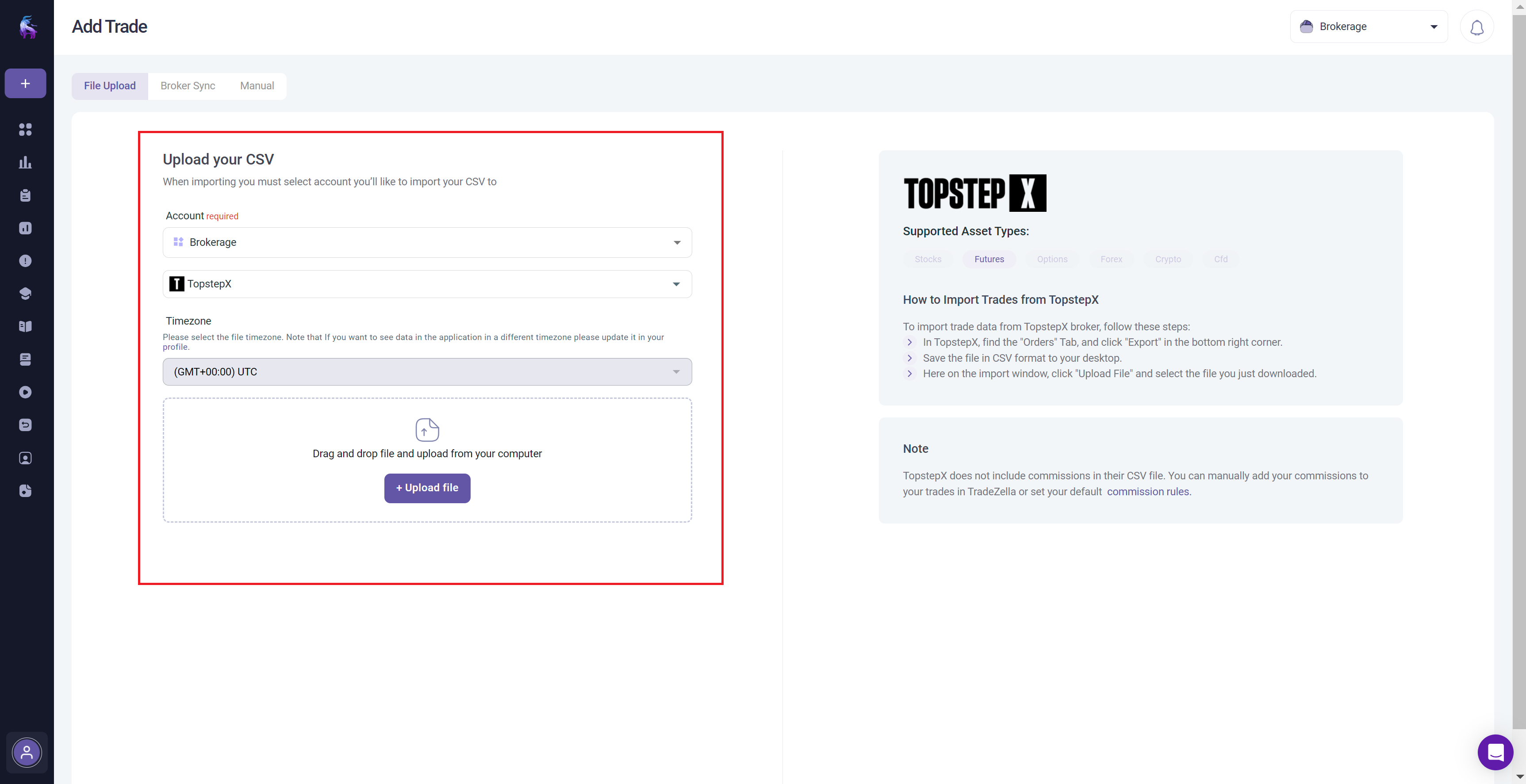 Select the account where you want to upload this file. Choose "Topstepx" from the broker list. Upload the saved CSV file containing your trades.