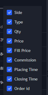 On the History table, on the right-hand side, there are three dots. Click on those three dots, which allow you to select the columns to export. Check all the boxes (Side, Type, Qty, Price, Fill Price, Status, Commission, Closing Time, Order ID).