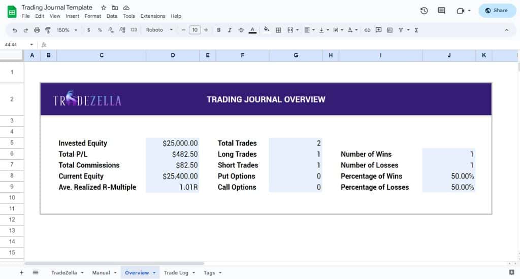 You don’t need to learn complicated formulas to calculate key metrics like your R-multiple and P/L. That’s all set up for you, so you can just add your data and see how you’re performing.